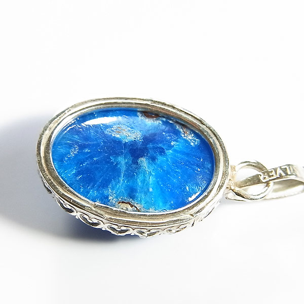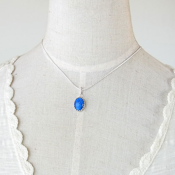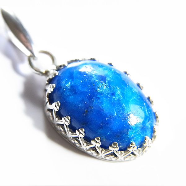 鮮やかなブルーグリーンのカバンサイトを飾り枠のシンプルなペンダントに仕上げました。 かなり目を惹く鮮やかなブルー。 肉眼では、画像よりももう少しグリーンがかったように見えますが、光源によっても色の雰囲気が かなり違って見える石のようです。