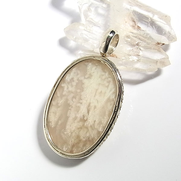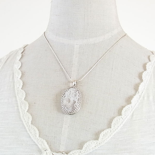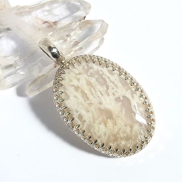 乳白色の半透明なアゲートに樹氷をそのまま閉じ込めたかのような模様の入った石を 白いのにモス(苔)ってのも変ですよね。(笑) 飾り枠はレース素材などのお洋服では引っ掛かりなどがあるかもしれませんので ご注意ください。 | |
