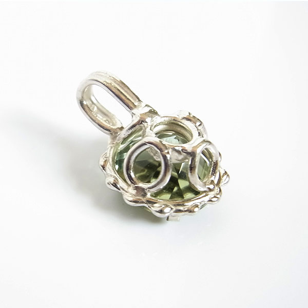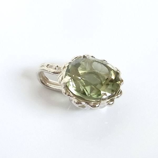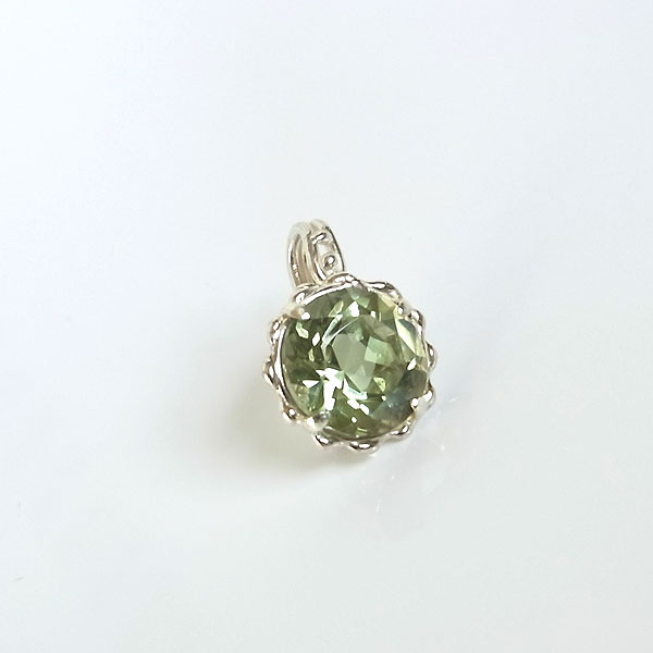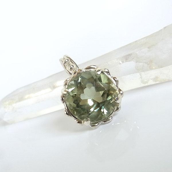 輝きの美しいグリーンアメシストを石枠の周りにテクスチャをあしらったペンダントに仕上げました。 石の輝きとシルバーの輝きがマッチした品のあるデザインのペンダントです。 *グリーンアメシスト* 僅かですがインクルージョンが見られますので、ご了承ください。 |