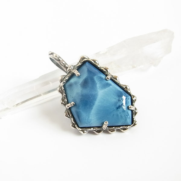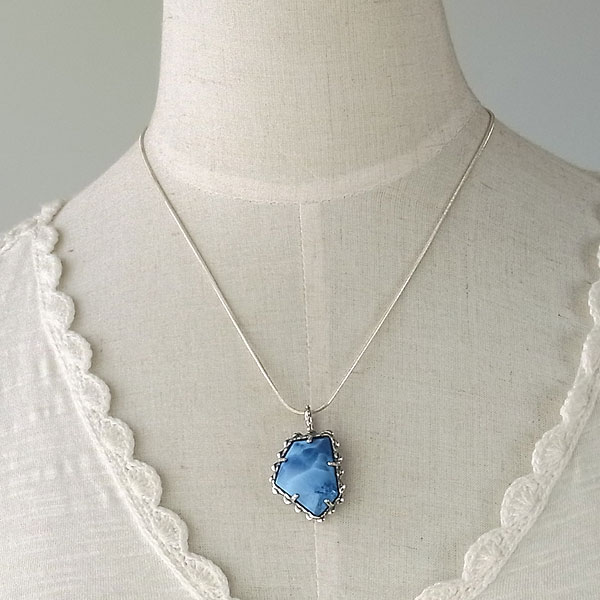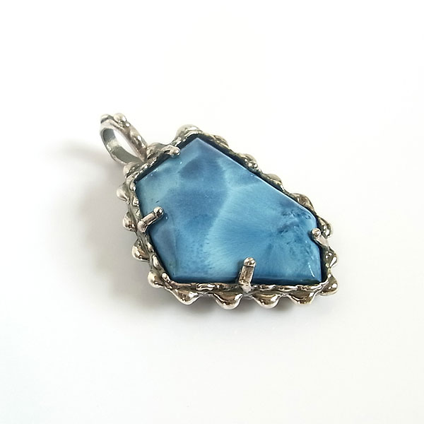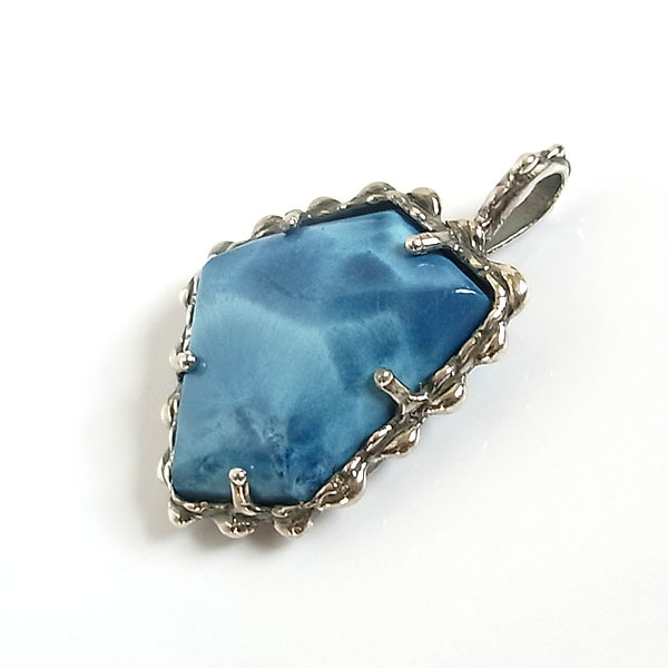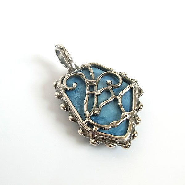 鮮やかなブルーの美しいシャタック石を裏飾りを施したデザインペンダントに仕上げました。