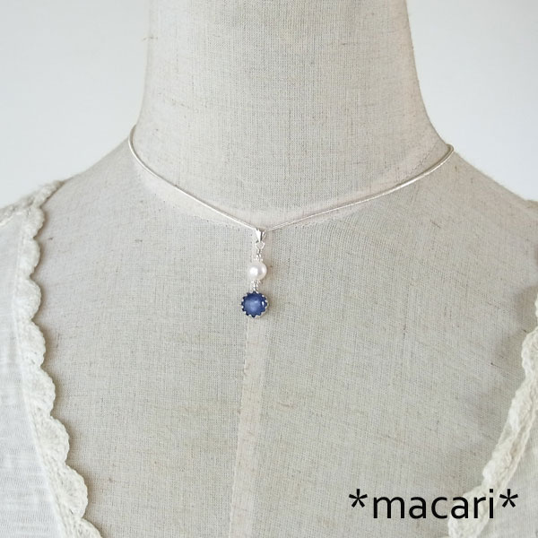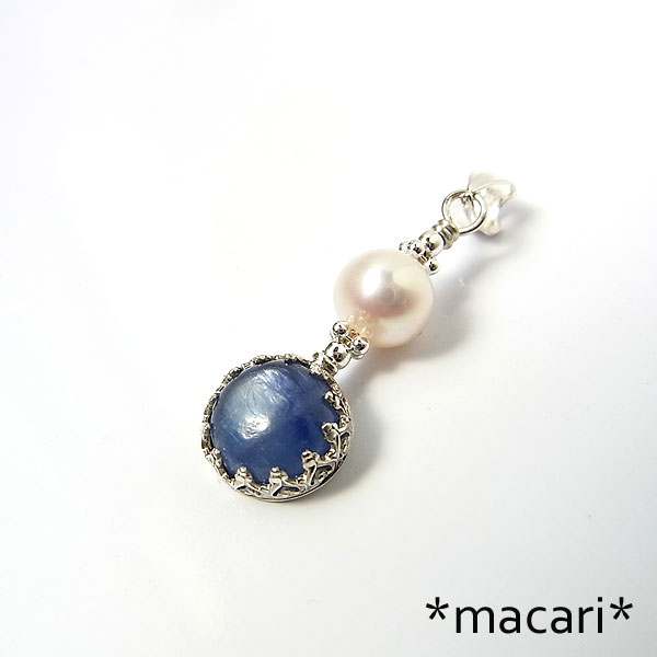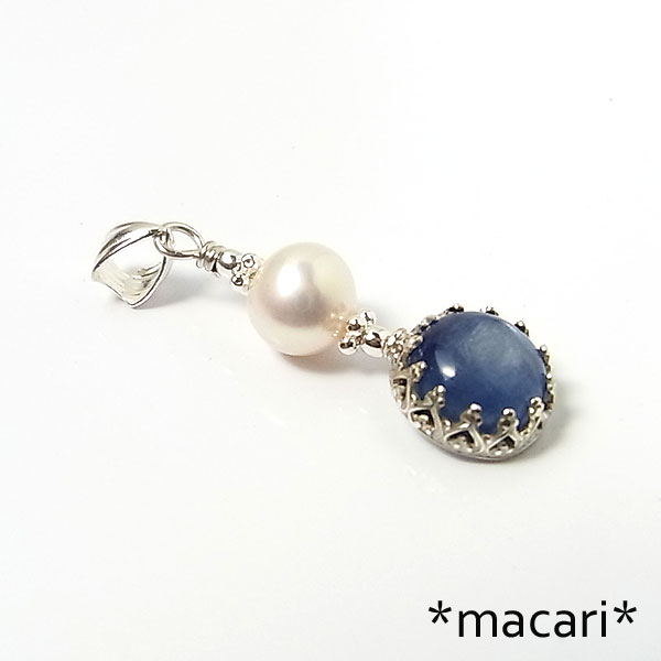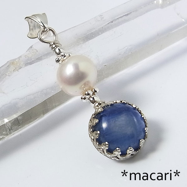 濃いブルーの発色が美しいカイヤナイトに艶やかな淡水パールを飾り付けた