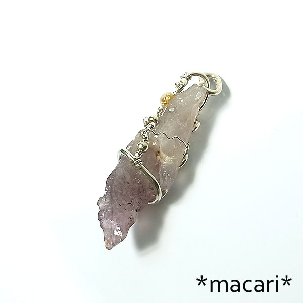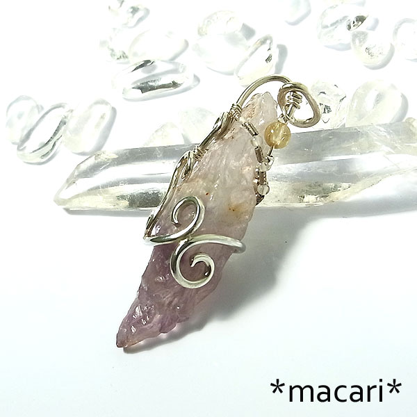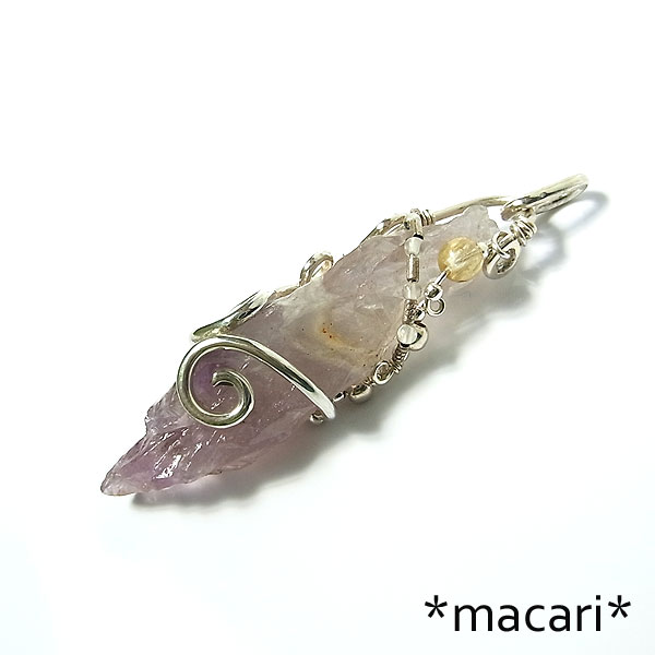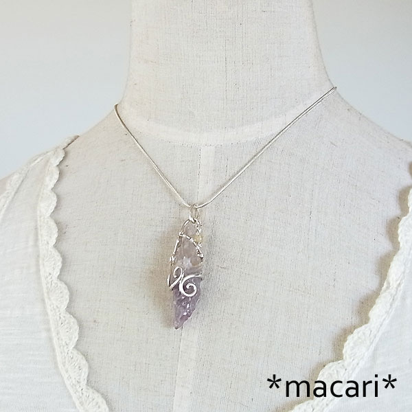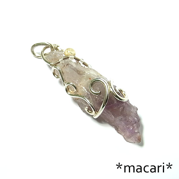 複雑な形状の面白いオーラライトと命名されているアメシストを銀線で唐草モチーフのペンダントに仕上げました。