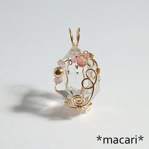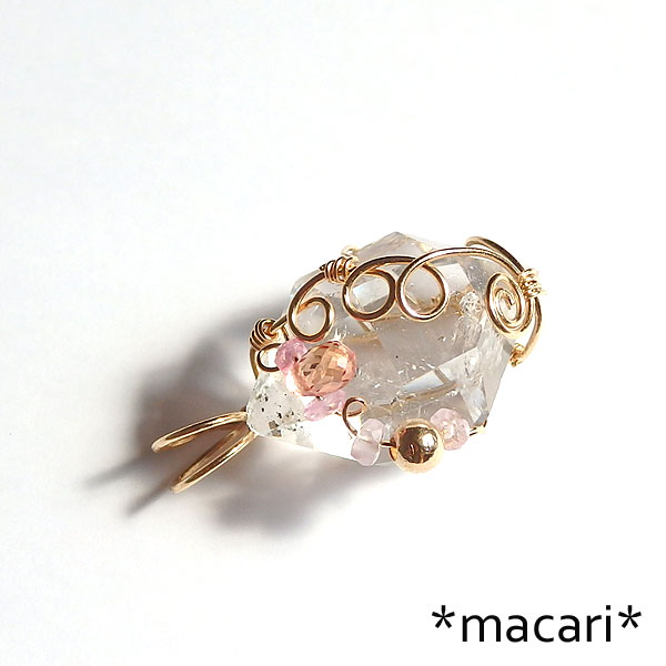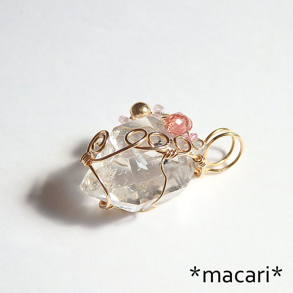 黒いインクルージョン等が見られますが、形の整った透明感の美しいハーキマーダイヤモンド(水晶)を 彩にピンク系のサファイアを飾り付けた愛らしい印象のペンダントです。
