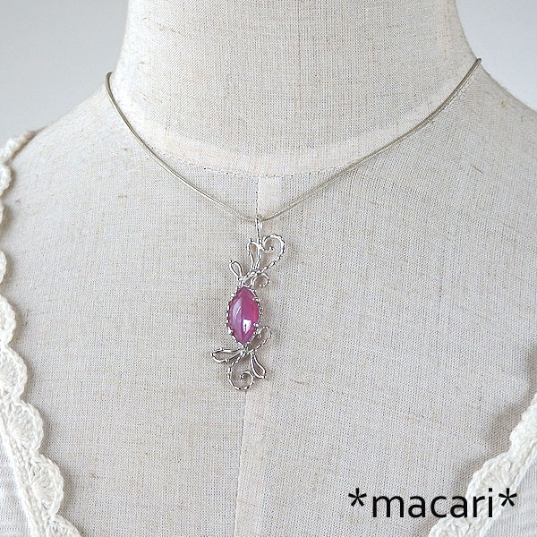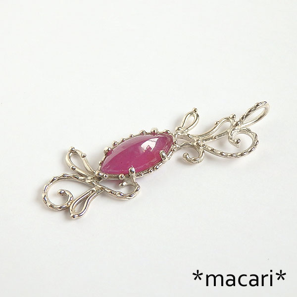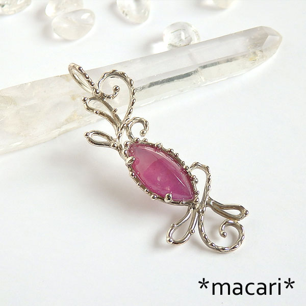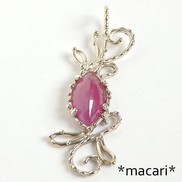 マーキス型のピンクサファイアを流れるようなラインの個性的な唐草飾りに留めたペンダントに仕上げました。 繊細なデザインの為、強い力を加えないように優しくお取扱いください。
