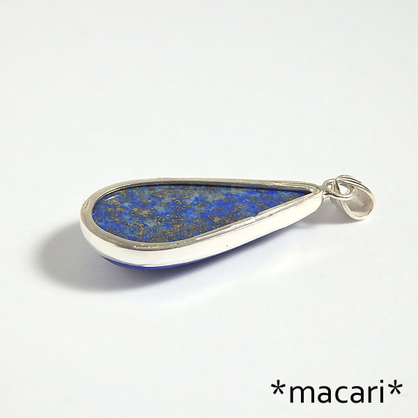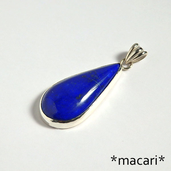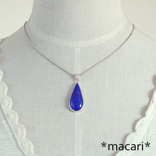 群青色の美しいラピスをシンプルなペンダントに仕上げました。 少し明るい青色に写っていますが、肉眼で見ると少し暗めの色合いです。 実際はもっと明るく写っていたので、暗く調整したのですが、これが限界・・・ 人形にかけてあるペンダントの色合いが肉眼で見た時に近い感じです。