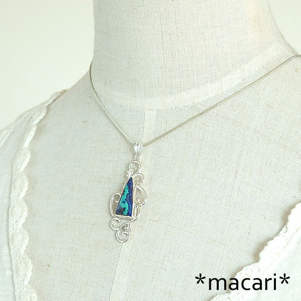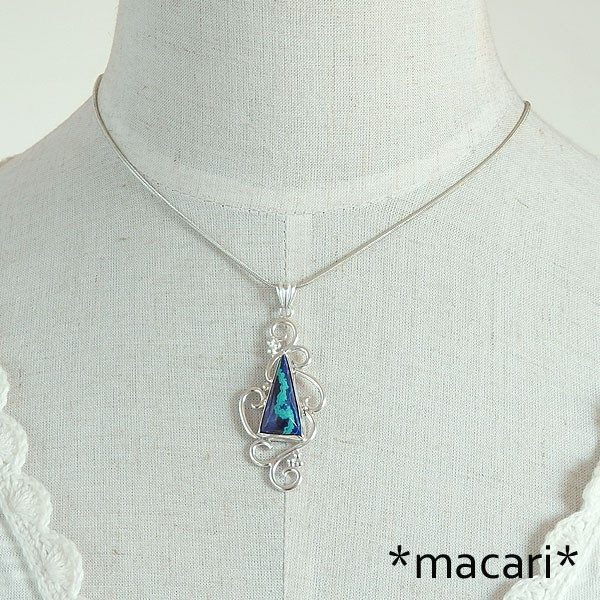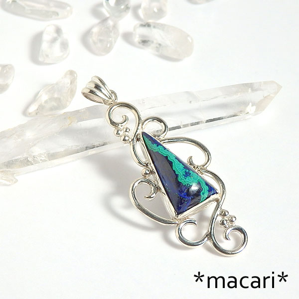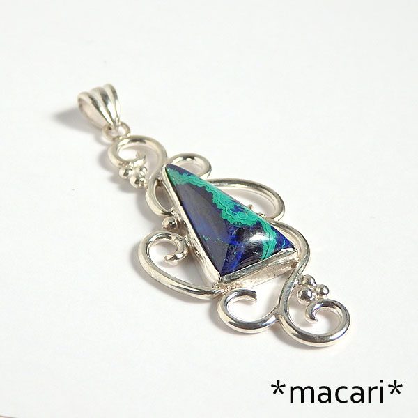 シャープな形状のアジュラマラカイトを取り囲むように唐草を這わせたようなデザインのペンダントに仕上げました。 アズライトの深いブルーとマラカイトのグリーンのバランスや模様が大変美しい石です。