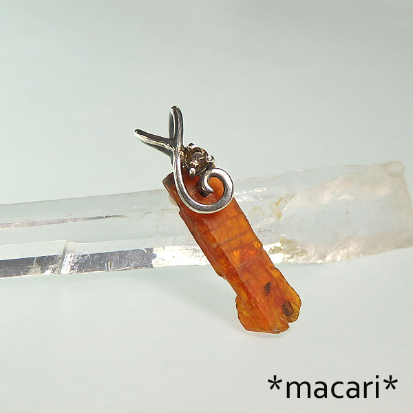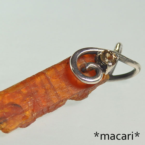 オレンジ色のカイヤナイト原石を小さなブラウンカラーのジルコンを飾り付けた唐草バチカンで留めた *ちょっと照明の影響で明るく写っていますが、実物は少し暗めの色合いです。