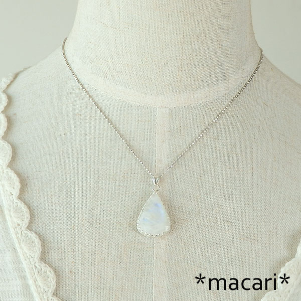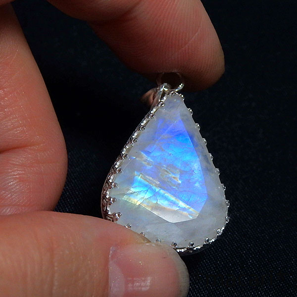 角度によってブルーやイエローの輝きが浮かび上がるレインボームーンストーンのペアシェイプカットを 名前にムーンストーンとつきますが、鉱物としてはラブラドライトに近いものになります。 明るい場所で見るよりも暗がりでスポット的に光を当てるほうが輝きが強く見られますよ。^^