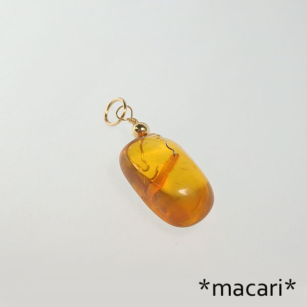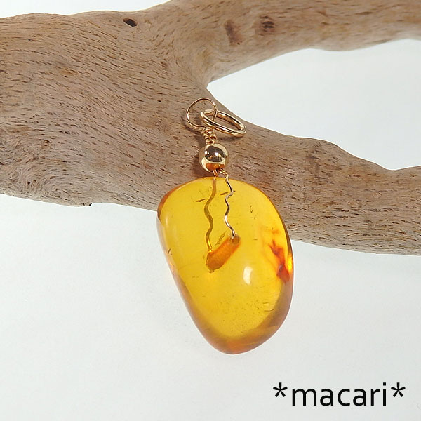 アンバーのペンダントトップ 蜂蜜のような美しい色合いのアンバー(琥珀)をk14GFでシンプルなペンダントトップにしました。 タンブルカットにワイヤーを通していますので琥珀の向きが変わったりしますが こちらはbr_433のアンバーとビルマ翡翠のブレスレットに付属するペンダントトップです。 *少し小傷が見られますので、 ご了承ください。 |