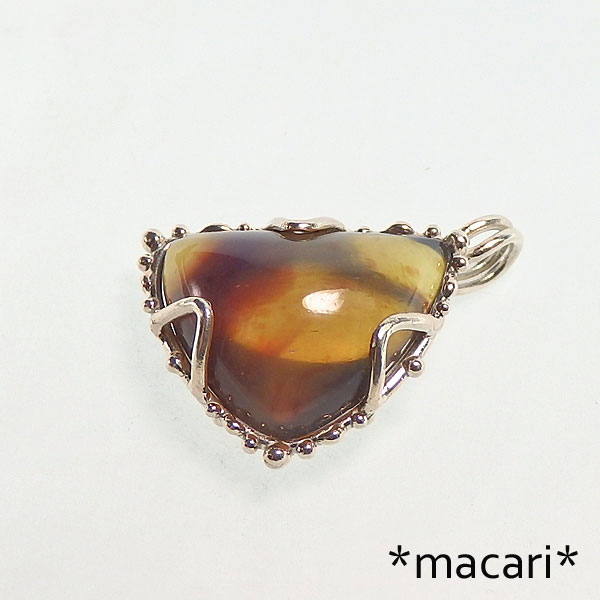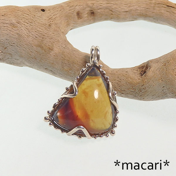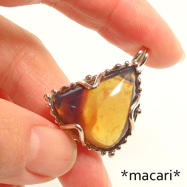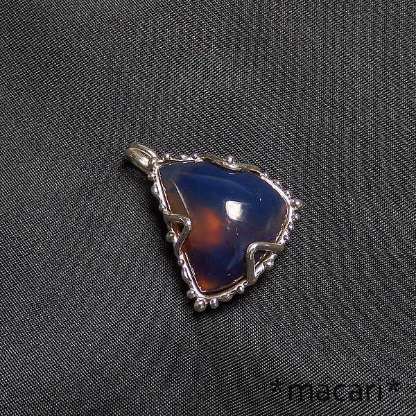 スマトラ産 ブルーアンバーの粒飾りペンダント インドネシア スマトラで産出する美しいブルーアンバーを 赤みがかった濃いブラウンカラーで、両面にふくらみのある少し面白い形のアンバーです。