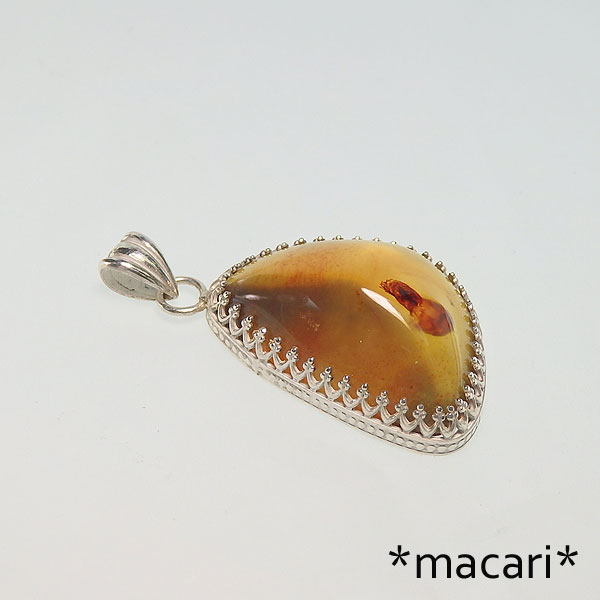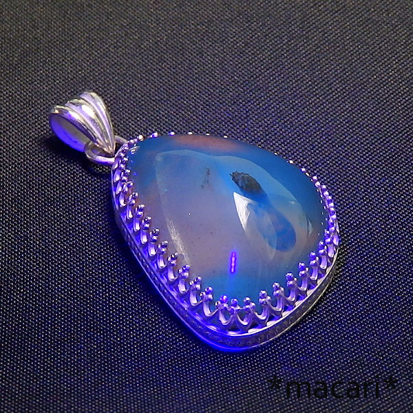 スマトラ産 ブルーアンバーの飾り枠ペンダント インドネシア スマトラで産出する美しいブルーアンバーを飾り枠のペンダントに仕上げました。 ブルーアンバーというとドミニカ産が主流でしたが、ここ数年スマトラ産のブルーアンバーが 多く見られるようになりました。 蛍光も大変強く、黒い背景ですと蛍光灯でも、ぼんやり青く輝く様子がご覧いただけます。