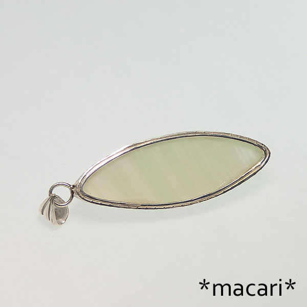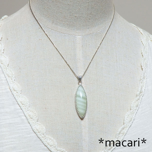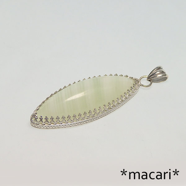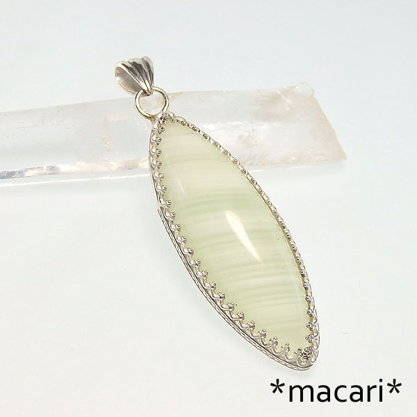 淡いグリーンとホワイトの縞模様が愛らしいグリーンカルサイト(?)を 飾り枠のシンプルなペンダントに仕上げました。