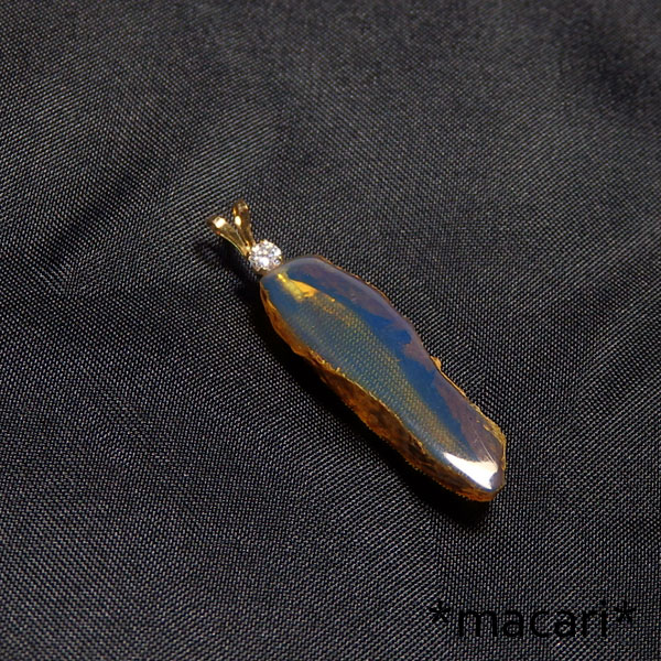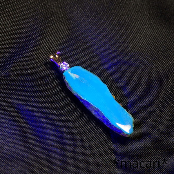 ブルーアンバーの原石を両面磨いただけの個性的なペンダントです。 小粒ですが、強蛍光の美しいブルーアンバーですよ。^^