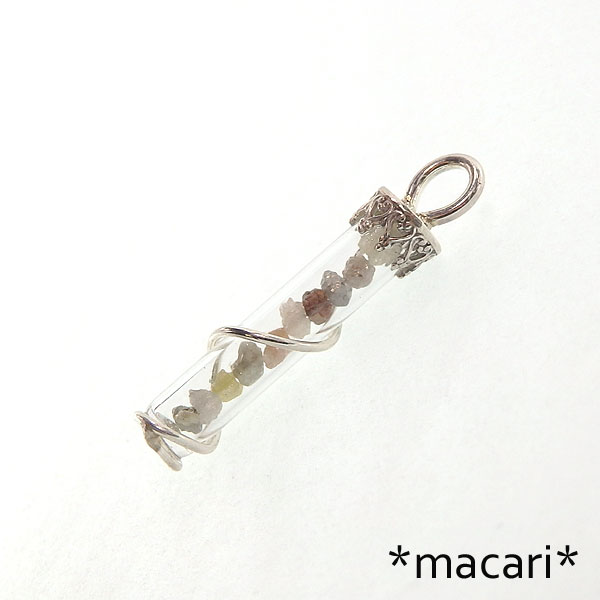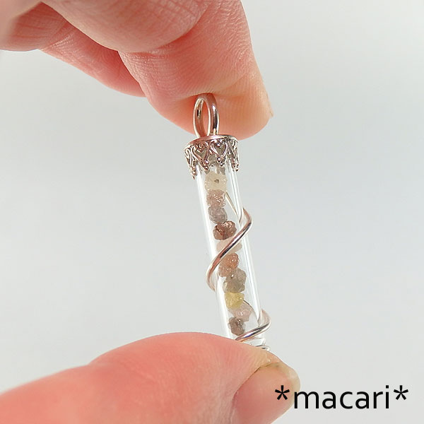 ダイヤモンド原石のボトルペンダント 小さな試験管の様なガラスボトルに、小さなダイヤモンド原石を閉じ込めた 地味目の色合いですが、光に当たるとキラキラして大変美しい石です。 こちらのダイヤモンド原石はビーズなので穴が開いています。