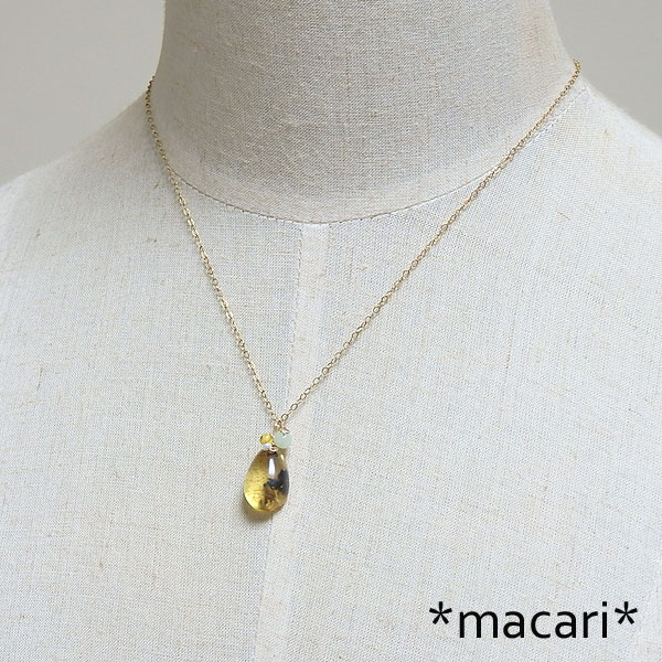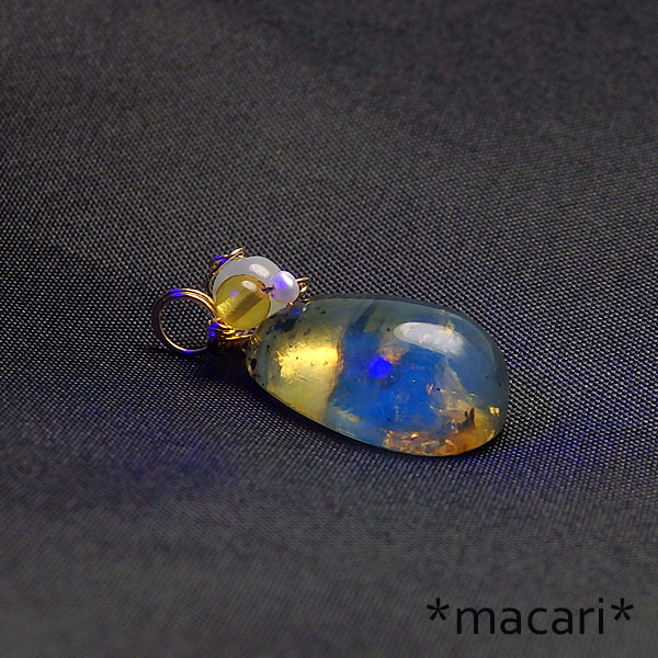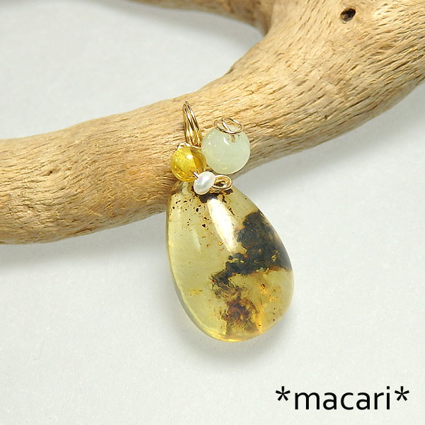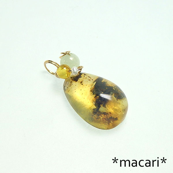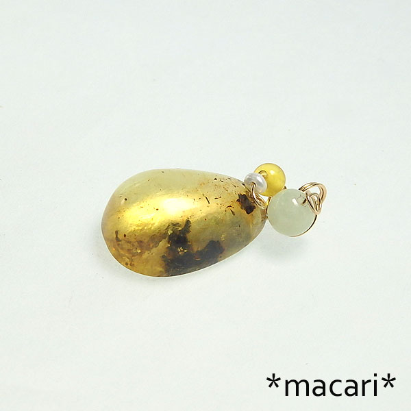 ブルーアンバーと天然石ビーズのペンダント 小型のブルーアンバールースに穴をあけk14GFワイヤーで琥珀、ビルマ翡翠、淡水ケシパールを飾り付けた インクルージョンは見られますが、アンバーの色合いがとても綺麗ですよ。