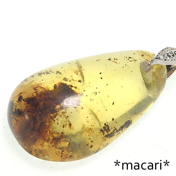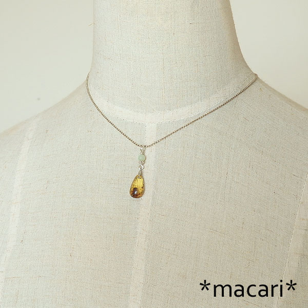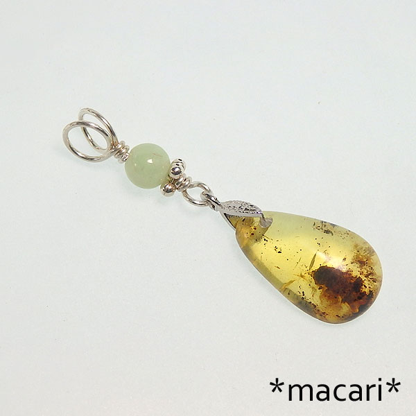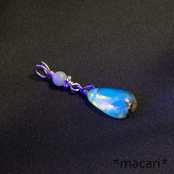 ブルーアンバーとビルマ翡翠のペンダント 小型のドミニカ産ブルーアンバールースに穴を開けて金具を通し、 内包物は見られますが、透明感のある綺麗なブルーアンバーですよ。 *アンバーの裏側に少し窪みが見られますので、ご了承ください。 *ブルーアンバー* こちらはドミニカで産出する希少琥珀です。 蛍光性の度合いによってお値段が変わってきますが、こちらは蛍光が弱めの為 |