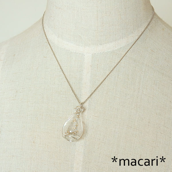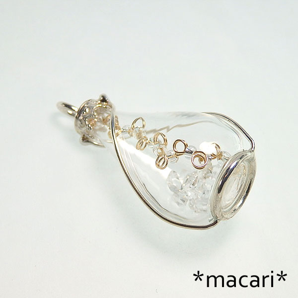 ハーキマーダイヤモンド(水晶)のボトルペンダント(オブジェ風) プックリしたガラスボトルにハーキマーダイヤモンド(水晶)とk14GFワイヤーにガラスビーズを通した飾りを こちらのボトルは自立しますので、そのままお部屋に飾っていただいても可愛いかと思います。^^ ガラスで出来ていますので、大変デリケートです。 こちらはボックスにお入れしてお送りいたします。