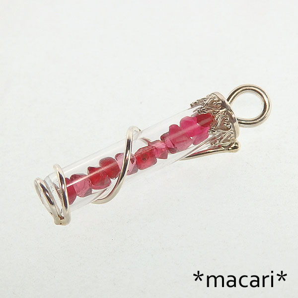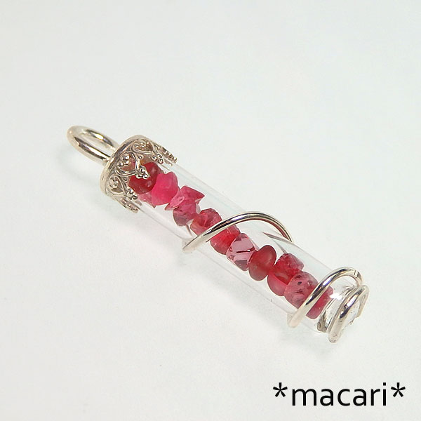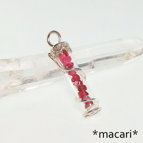 スピネル原石のボトルペンダント 濃いピンク〜レッドのスピネル原石を試験管のような細身のガラスボトルに閉じ込めて こちらのスピネルはタンブル状の物から八面体の結晶の形を残したものなどがあります。 恐らくスピネルの鉱脈が川に浸食され、原石が流れだして川の砂や砂利で磨かれたものかと思います。