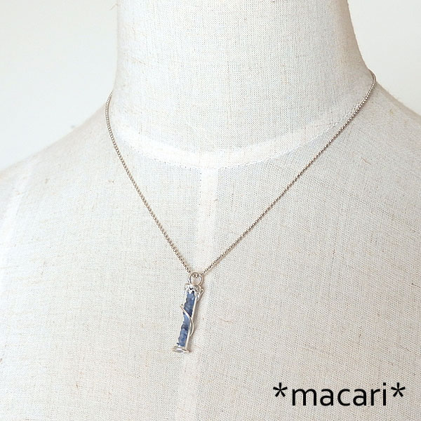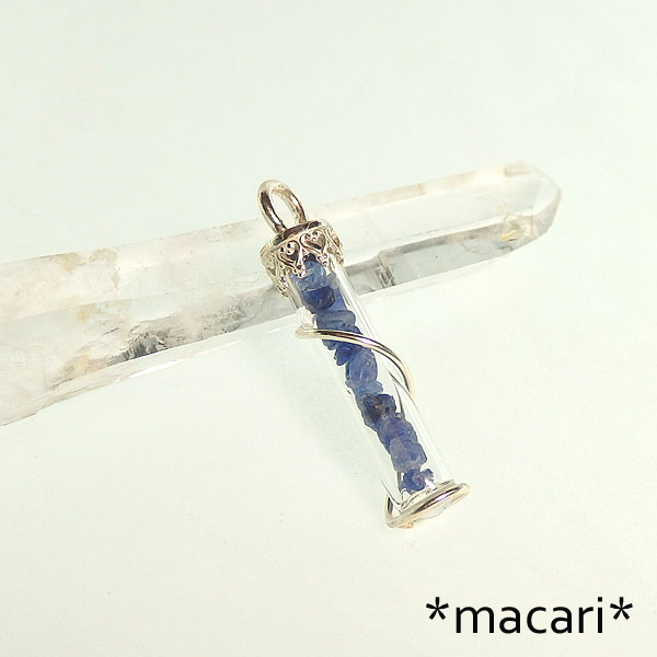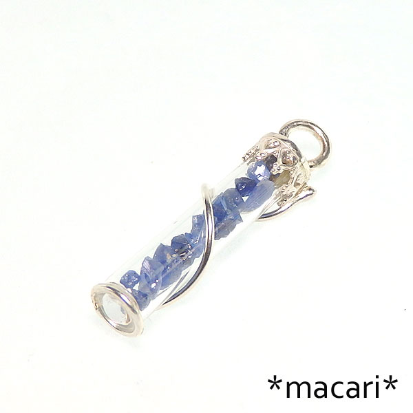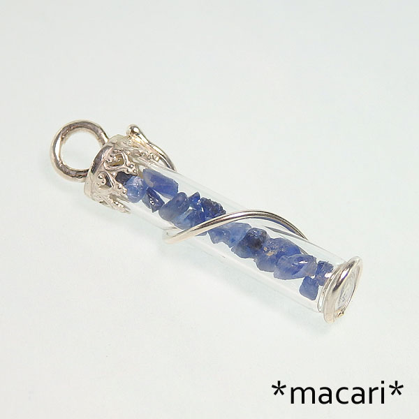 サファイア原石のボトルペンダント 爽やかなブルーのサファイア原石を試験管のような細身のガラスボトルに閉じ込めた こちらはサファイアの結晶の形はとどめていない欠片ですが、非加熱品なので 光に翳してみると画像よりもさらに綺麗ですよ〜♪