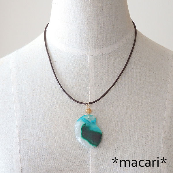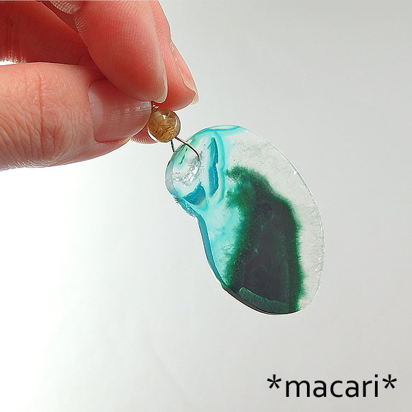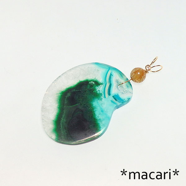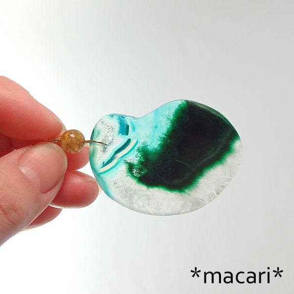 クリアクォーツにマラカイト(孔雀石)の入り込んだ美しいスライスをk14GFワイヤーでシンプルなペンダントに仕上げました。 光に翳すとマラカイトの部分が毛羽立ったような入り方をしているのが見えて面白いですよ♪ こちらは穴あけしたのではなく、ドルゥージー(微細な結晶)のある部分がへこんでいて あまり厚みがありませんので、強い衝撃を与えないように |