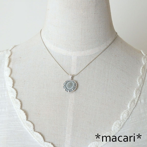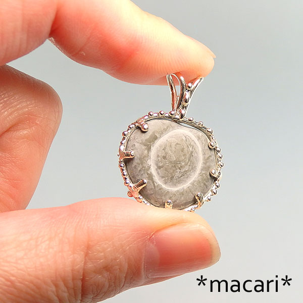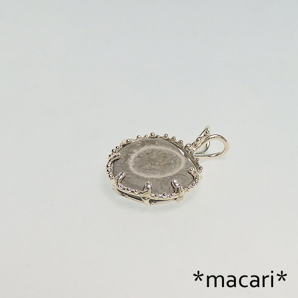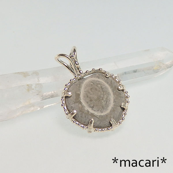 カナダのケベック州にある河川や湖の底から産出するフェアリーストーンと呼ばれる石を シルバーのデザインペンダントに仕上げました。 氷河の湖底で自然に形成されたもので、主成分はカルサイトになります。 ネイティブアメリカンの間では、健康と繁栄のお守りとして用いられたようです。 はじめて見た時は面白いな〜と思うだけで、アクセサリーにしようなどとは考えもしなかったのですが 幾度か目にするうちに、小ぶりなのが見つかれば何か作ってみたい!と思うようになり やっと手ごろな大きさを入手できました。^^ とても風変りですが、愛嬌のある石ですよ♪ *硬度が低めなので優しくお取扱いください。