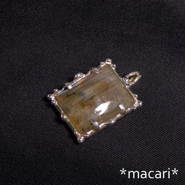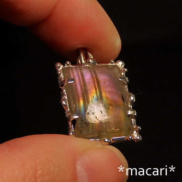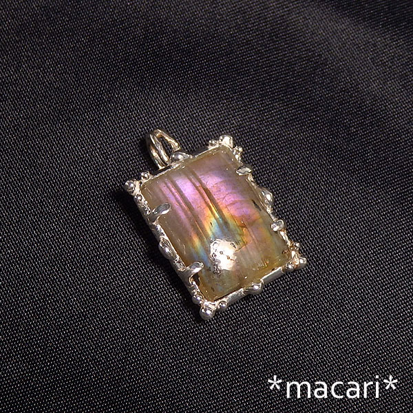 角度によってピンク、イエロー、ブルーの光が鮮やかに浮かぶラブラドライトを 額縁の様なデザインのペンダントに仕上げました。 *ラブラドライト* (斜長石) カナダのラブラドールで発見されたことからラブラドライトと呼ばれる斜長石。 ブルーやグリーンなどの光が浮かび上がり、大変美しい石です。 こちらはラブラドライトでは、ちょっと珍しいピンク系の光が中心に浮かび上がります。