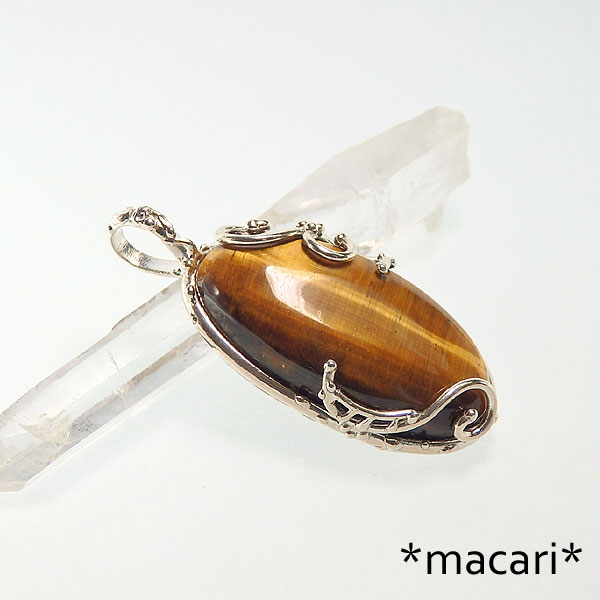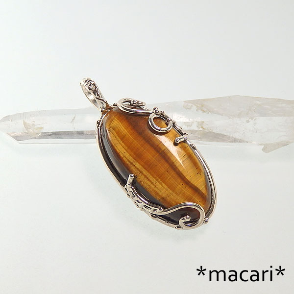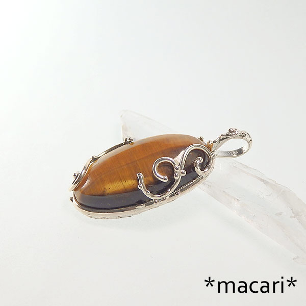 タイガーズアイの唐草ペンダント 大粒のタイガーアイにアシンメトリーな唐草を這わせたペンダントです。 この石は男性的なデザインの物が多いのですが、唐草の曲線を組み合わせることで