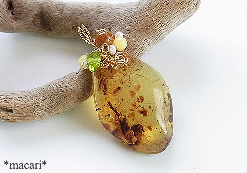 【使用石】ブルーアンバー 36×24×10ミリペリドット 7ミリミルキーアンバー4ミリルチルクォーツ6ミリ淡水パール2.5ミリ【サイズ】全体の長さ45ミリ(バチカン含む)ネックレスは付属しません。【使用金属】 k14GF(ゴールドフィルド)