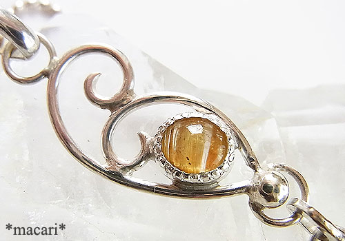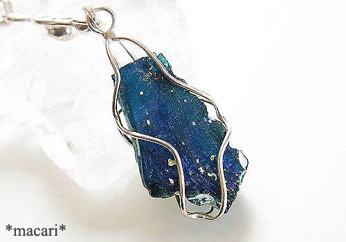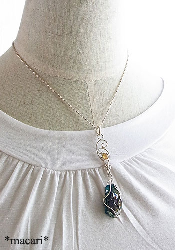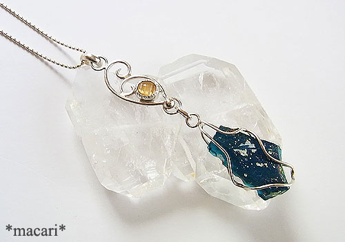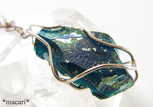 長い間、地中に埋もれることで、銀化現象を起こし表面に美しい輝きをまとった「ローマングラス」ソーダガラスの欠片で、それ自体は天然のものではありませんが、あまりに綺麗なので、ルチルクォーツと組み合わせたペンダントに仕上げてみました。濃いブルーの欠片に様々な色がキラキラと輝きます。