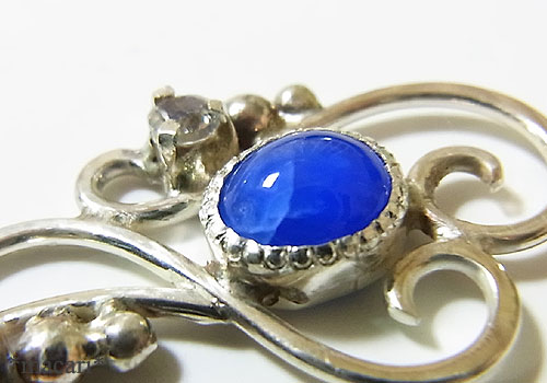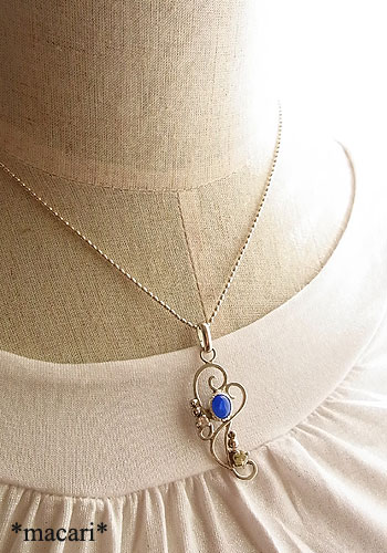 純粋なアフガナイトはもともと無色ですが、こちらはラズライトによって鮮やかなブルーに色付いています。暗いところでブラックライトを当てると、部分的にほんのりオレンジピンクに発光しますよ。クリソベリルとホワイトラブラドライトを組み合わせたデザインペンダントに仕上げました。 アフガナイトはクラックのような白い部分が見られますので、ご了承ください。