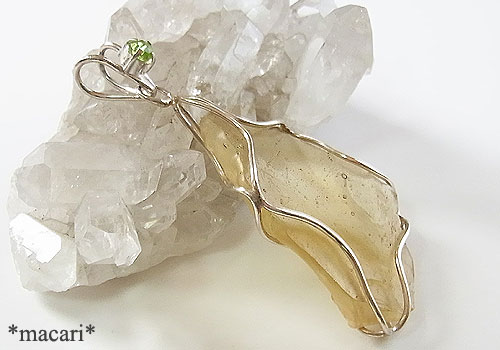 以前アップした原石より、さらに大きいリビアングラスを銀線で閉じ込め、バチカンに小さなペリドットを飾りつけたペンダントです。