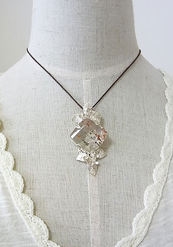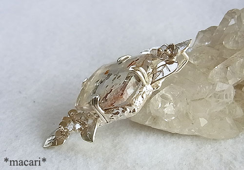 パイライトやヘマタイトを内包した水晶に小さなお花の飾りをつけたペンダントに仕上げました。