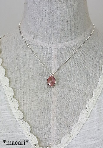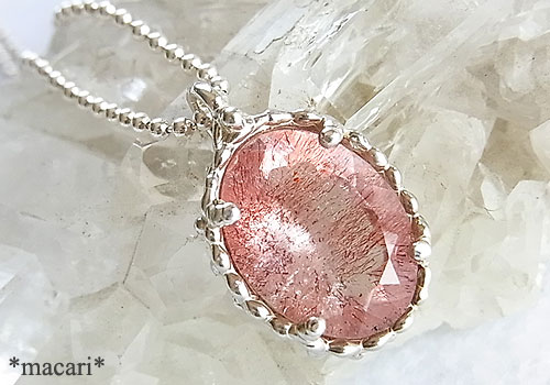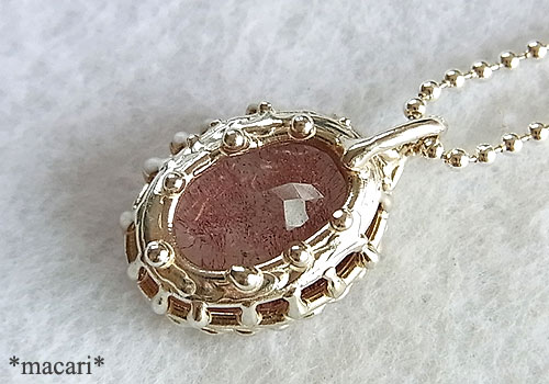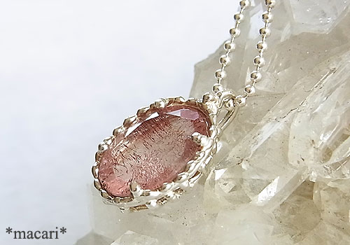 ゲーサイトを内包し、ピンクに色付いた水晶のファセットカットルースを銀の粒かざりをつけたペンダントに仕上げました。