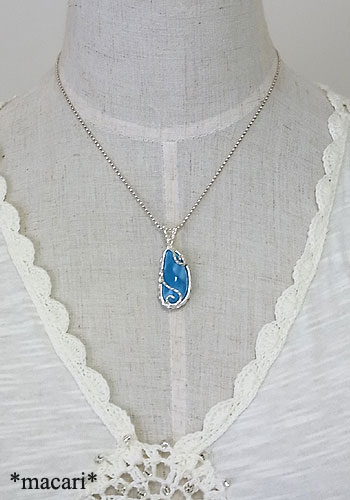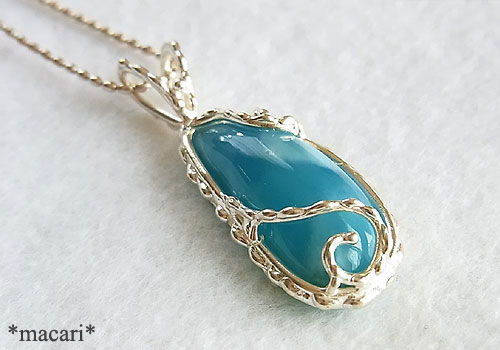ディープブルーの美しいフリーシェイプのラリマーを粒飾りをつけた唐草フレームの枠に留めたペンダントです。