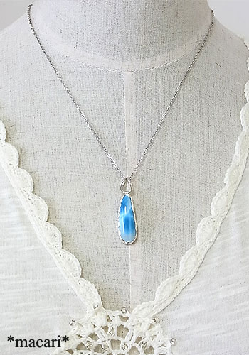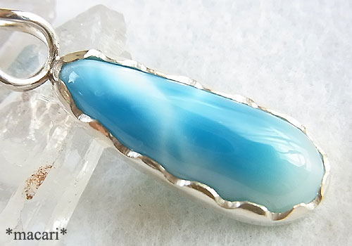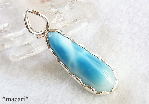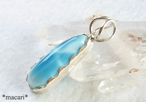 模様の美しい細めのドロップ型ラリマーを波型の縁のペンダントに仕上げました。こちらのラリマーは十数年前に購入し、コレクションとして保管していたものです。