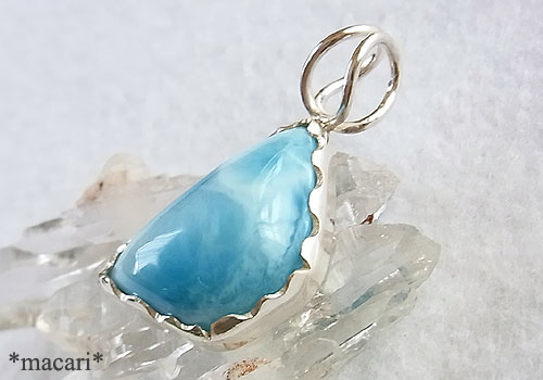 模様の美しいフリーシェイプのラリマーを波型の縁で留めたシンプルなペンダントです。シルク光沢もあり、見る角度によってさまざまな表情を現す美しいAAAグレードのラリマーですよ。