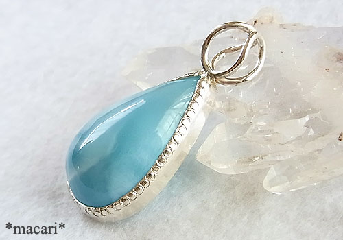 海の水をそのまま固めてしまったかのような、美しい透明感のあるドロップ型ラリマーをシンプルなペンダントに仕上げました。石の縁にミル打ちを施してあるので、光に当たるとキラキラして綺麗です。^^