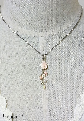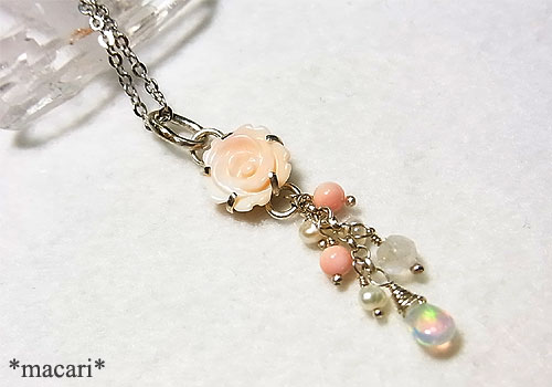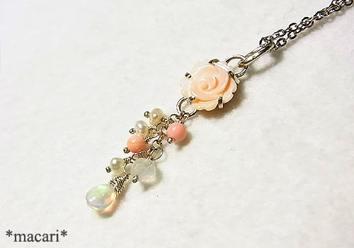 小さなコンクシェルの薔薇に、エチオピアオパールをぶら下げ、淡水パールやコンクシェル、ラブラドライトのビーズを飾り付けた華奢な雰囲気のペンダントです。