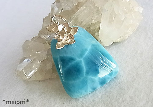 大型のAAAラリマーに小花飾りをつけたシンプルなペンダントです。模様も綺麗に出ている発色のよい美しいラリマー。裏側も綺麗に模様が出ています。