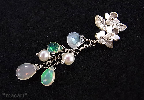 小花飾りにエチオピアオパール、ホワイトラブラドライト、淡水パールをぶら下げた愛らしい雰囲気のペンダントです。