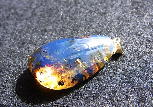 こちらの琥珀は蛍光性が強いので、黒い背景ですと太陽光や蛍光灯でも青く輝く様子がご覧いただけます。