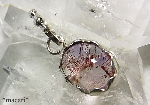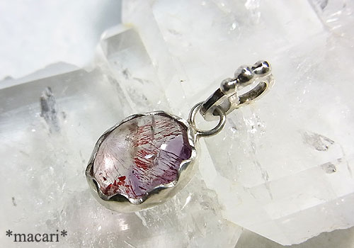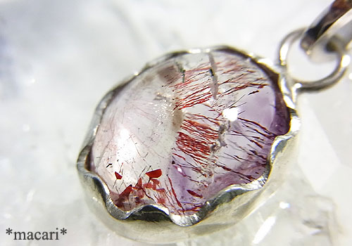 ゲーサイト(針鉄鉱)やレピドクロサイト(鱗鉄鉱)を内包した水晶を波型の石枠で留めた小ぶりのペンダントです。少しアメシストの部分も入り込んでいるので、角度によって色合いが変わって見えます。