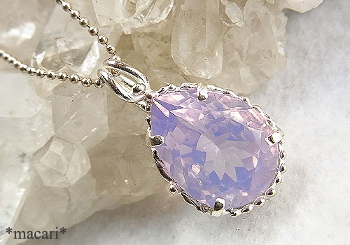 マダガスカル産のローズクォーツに青みを足したような、不思議な色合いの水晶。石の輝きとシルバーの色合いがマッチして、とても品のあるペンダントです。