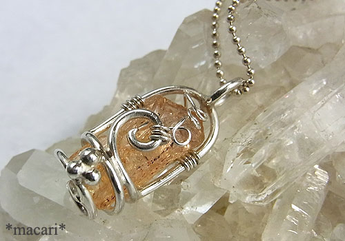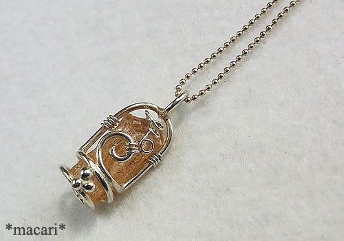 色合いが綺麗なインペリアルトパーズの原石を、シルバーワイヤーで作った籠に閉じ込めたペンダントです。先端には綺麗なクリスタルシェイプが見られます。内部に細かなクラックがあるため、光の当たり具合でキラキラと虹が見られますよ。^^