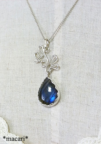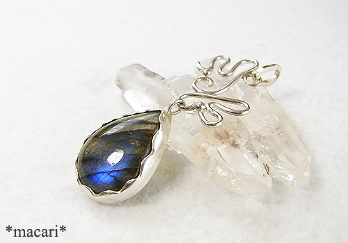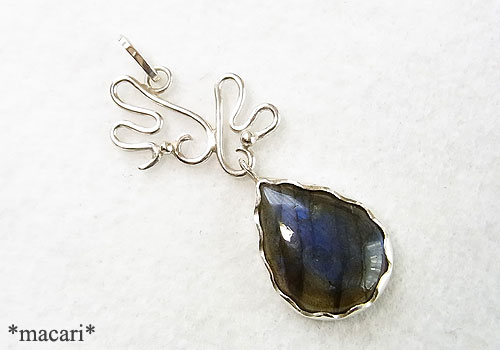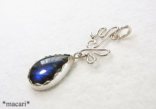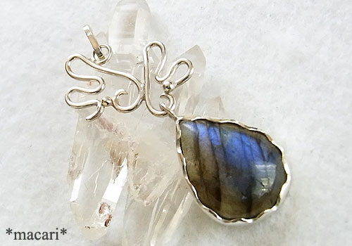 角度によって美しいブルーの光が浮かぶラブラドライトに変形型の翼モチーフを飾り付けました。うまく撮影できませんでしたが、画像より鮮やかなブルーが浮かび上がる美しいラブラドライトです。少し表面に凹みが見られますので、ご了承ください。