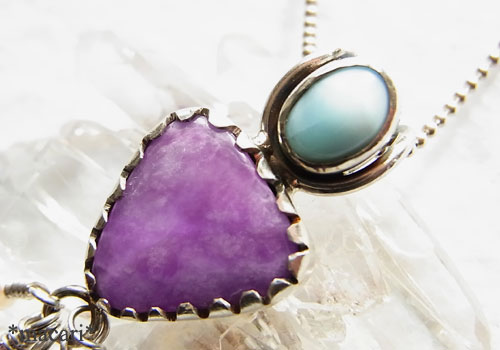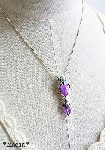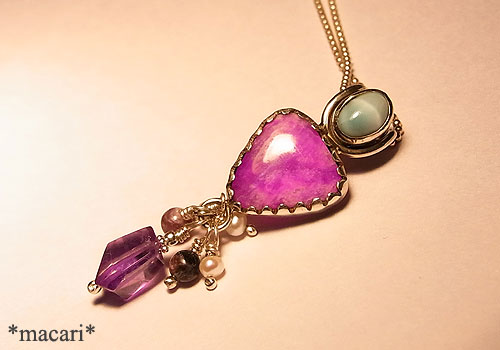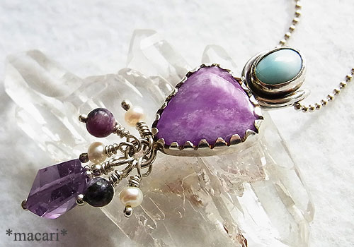 明るい紫が綺麗なスギライトの上に小粒のラリマーを留め、アメシスト、チャロアイト、淡水パールを飾りつけた個性的なデザインのペンダントです。