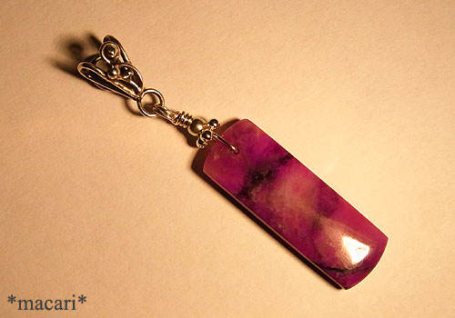 短冊形の大粒スギライトをシンプルなペンダントに仕上げました。両面使えるタイプの石なので、バチカンのデザインも両方とも使えるように少し飾りを変えています。こちらのスギライトは白熱灯で赤紫にカラーチェンジします。