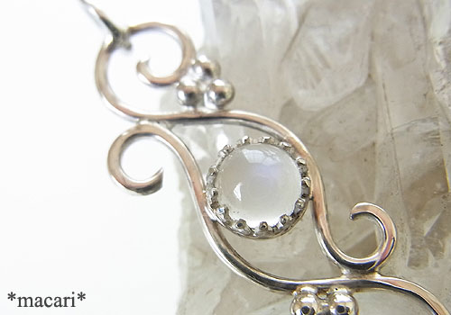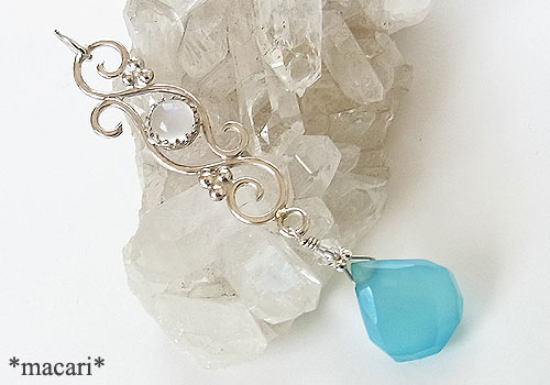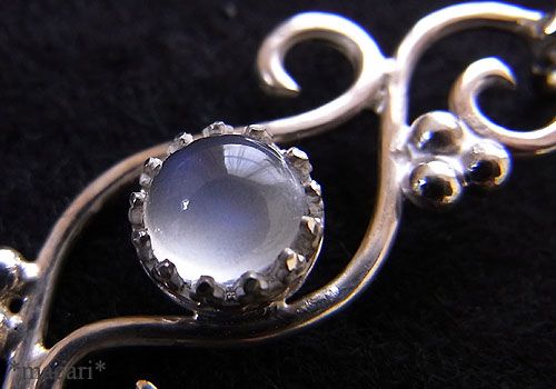 ボンヤリと青い輝きが浮かぶブルームーンストーンを唐草の飾りに留め、鮮やかな美しい色合いのシーブルーカルセドニーを飾りつけた個性的なペンダントです。こちらで使用のブルームーンは、鉱物的にはペリステライトになるかと思います。