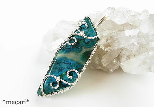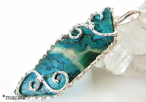 クリソコラに石英がしみ込んだクリソコラインクォーツのフリーシェイプカットを唐草飾りのシルバーペンダントに仕上げました。