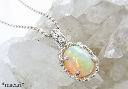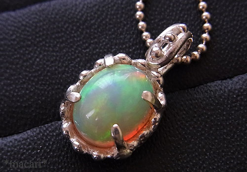 グリーン、ピンク、オレンジの遊色が大変美しいエチオピア産のオパールを粒飾りの可愛らしいペンダントに仕上げました。